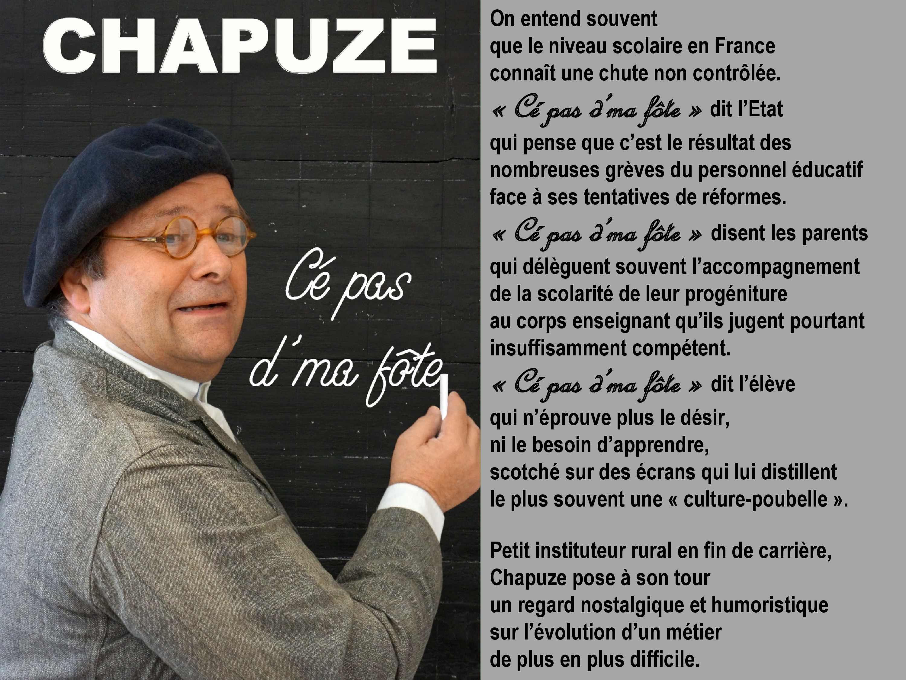 Petit instituteur rural en fin de carrière, Chapuze pose à son tour un regard nostalgique et humoristique sur l’évolution d’un métier de plus en plus difficile.